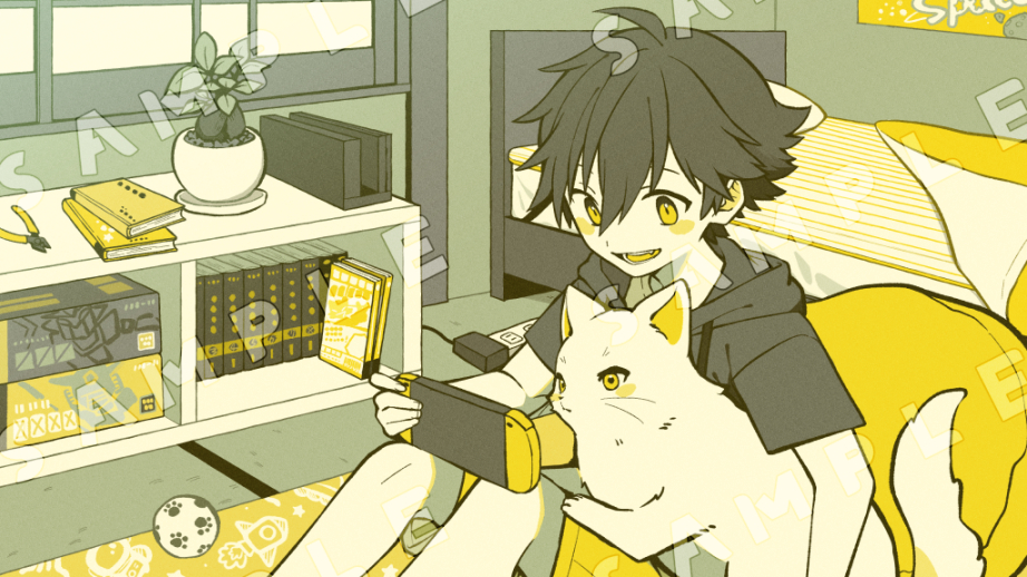 リクエスト内容:黄色基調・ゲーム・観葉植物・猫 を入れて貰うと嬉しい。